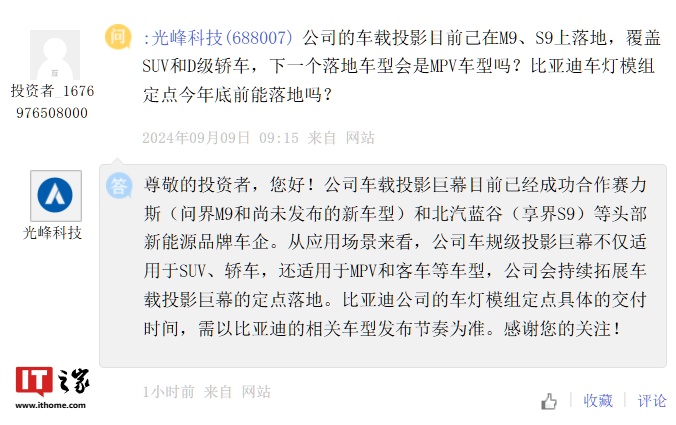 IT之家 9 月 11 日消息,有投资者询问光峰科技,“公司的车载投影目前已在 M9、S9 上落地,覆盖 SUV 和 D 级轿车,下一个落地车型会是 MPV 车型吗?比亚迪车灯模组定点今年底前能落地吗?”