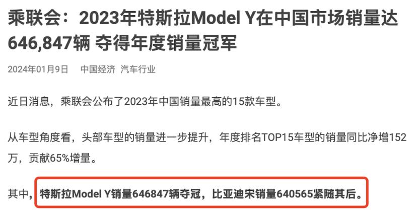 乘联会数据显示,2023年,特斯拉Model Y在中国市场销量达646847辆,夺得年度车型销量冠军。