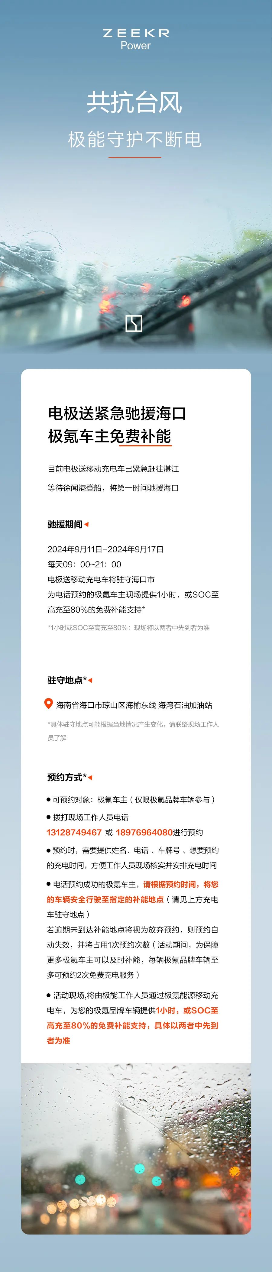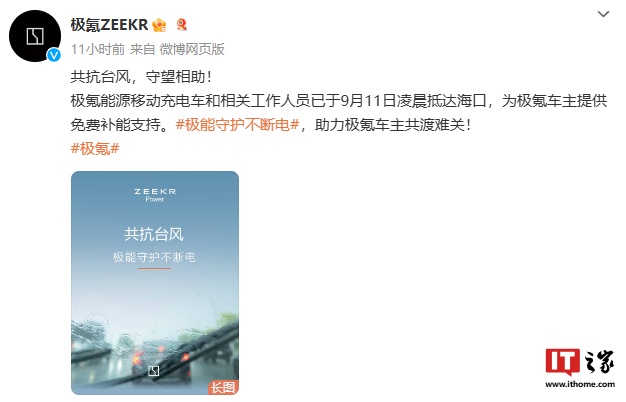 IT之家 9 月 11 日消息,极氪官方今日发文宣布,极氪能源移动充电车和相关工作人员已于 9 月 11 日凌晨抵达海口,为极氪车主提供免费补能支持。