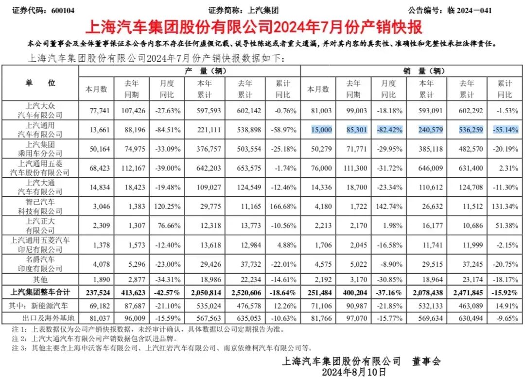 据上汽集团2024年7月份产销快报显示,上汽通用7月销量为1.5万辆,同比下跌82.42%; 前7个月的累计销量为24.05万辆,同比下跌55.14%。