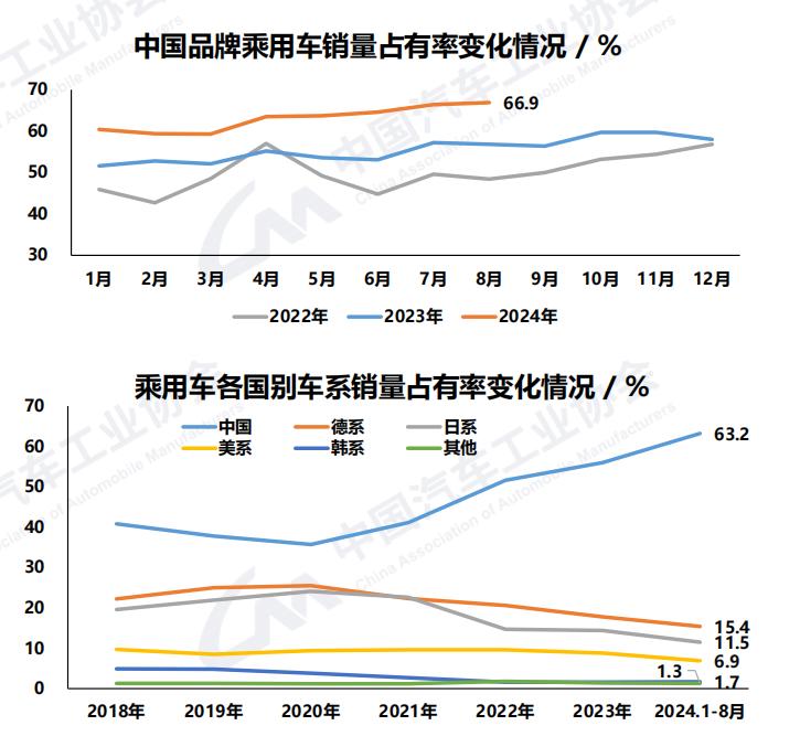 今年1-8月,中国汽协公布的数据显示,自主品牌的市场份额已经上升到了空前的66.9%,德系品牌和美系品牌则进一步下滑到了15.4%和6.9%,日系则降到了11.5%。