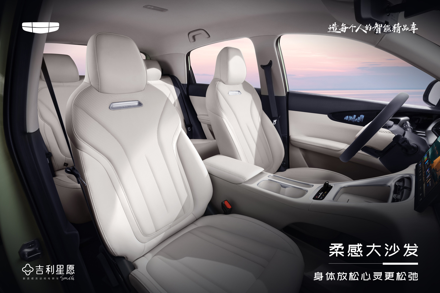 内饰方面,星愿配备双辐式双拼色多功能方向盘、大尺寸液晶仪表和悬浮式中控屏,空调出风口采用圆角矩形设计,内饰配色提供天镜白和仙踪绿两种选择。吉利星愿拥有 85% 的“得房率”,提供 36 处储物空间。