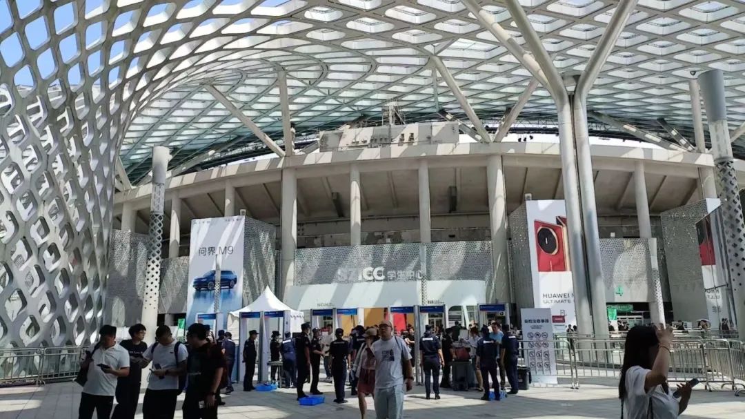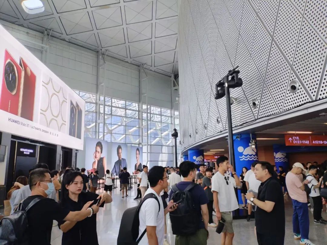 他所说的,是深圳湾体育中心的学生中心大门两侧高大的广告海报:右侧是华为三折叠屏手机Mate XT非凡大师,左侧是鸿蒙智行旗舰SUV问界M9,也是这次华为秋季发布会的两大重磅产品。