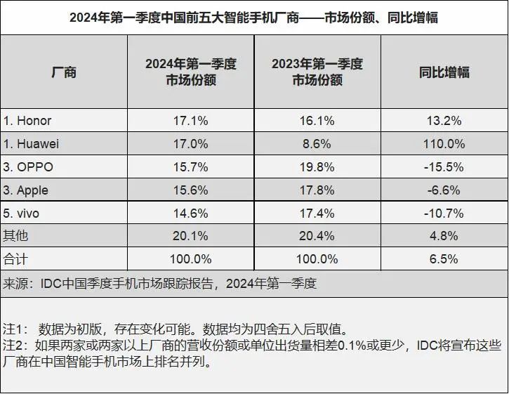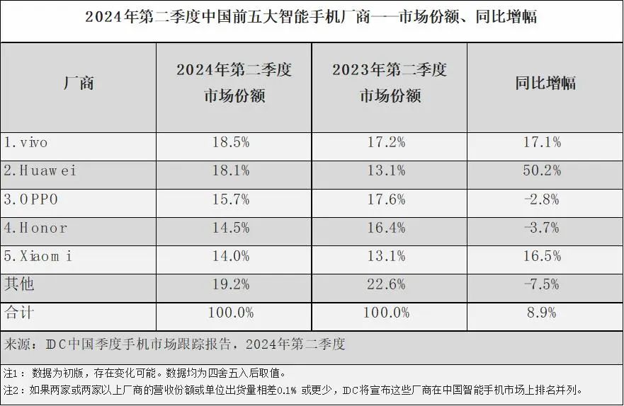 IDC数据显示,2024年第一季度和第二季度,中国智能手机市场出货量排名中,华为都是列在第二,份额分别为17.0%和18.2%,增幅分别为110%和50.2%。但荣耀和VIVO轮流登顶,导致整个上半年,华为反而以17.5%的市场份额成为冠军。