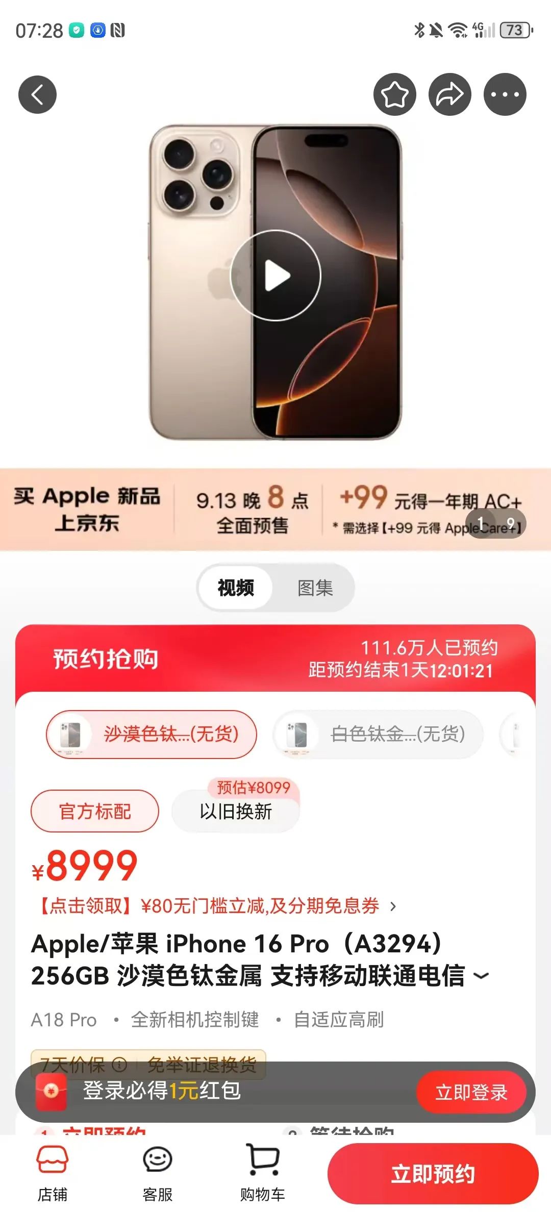 从京东平台可以查到,截至9月12日上午8点,iPhone 16 Pro和Pro Max预约量大约111.6万人,iPhone 16和iPhone 16 Plus都是22.4万人。