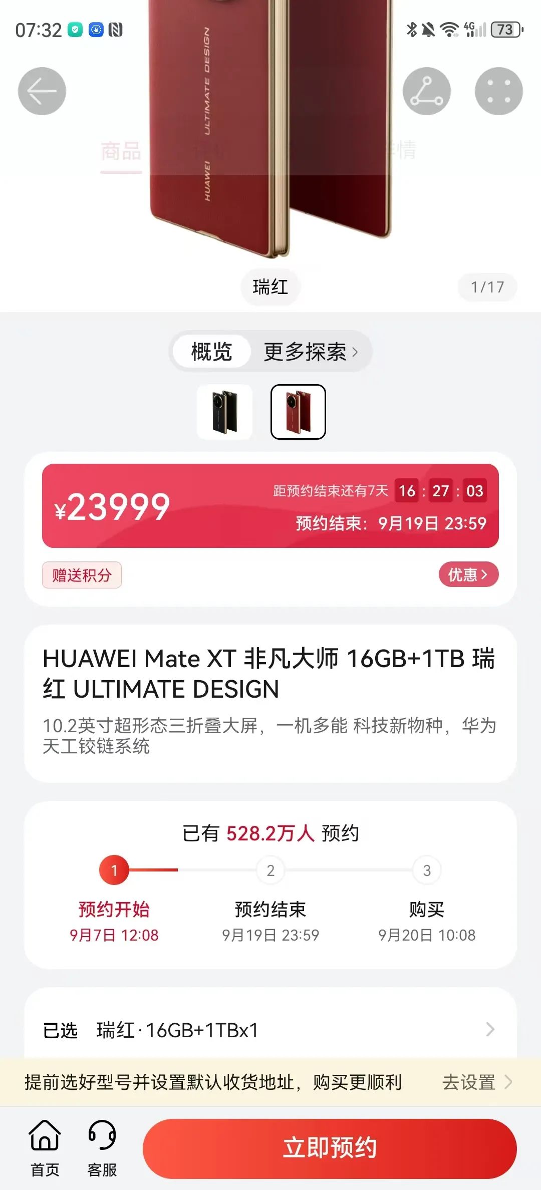 同一时间,在华为商城,三折叠屏Mate XT的预约总数已经达到528.2万人。
