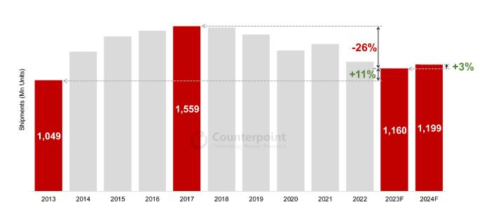 根据Counterpoint Research的统计数据,全球智能手机出货量的增长下跌曲线,以2017-2018年为顶峰,突破15亿台,而2023年为最低谷,同比下降5%至12亿台。
