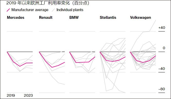 欧洲五大汽车制造商疫情前后的工厂利用率对比 彭博社制图