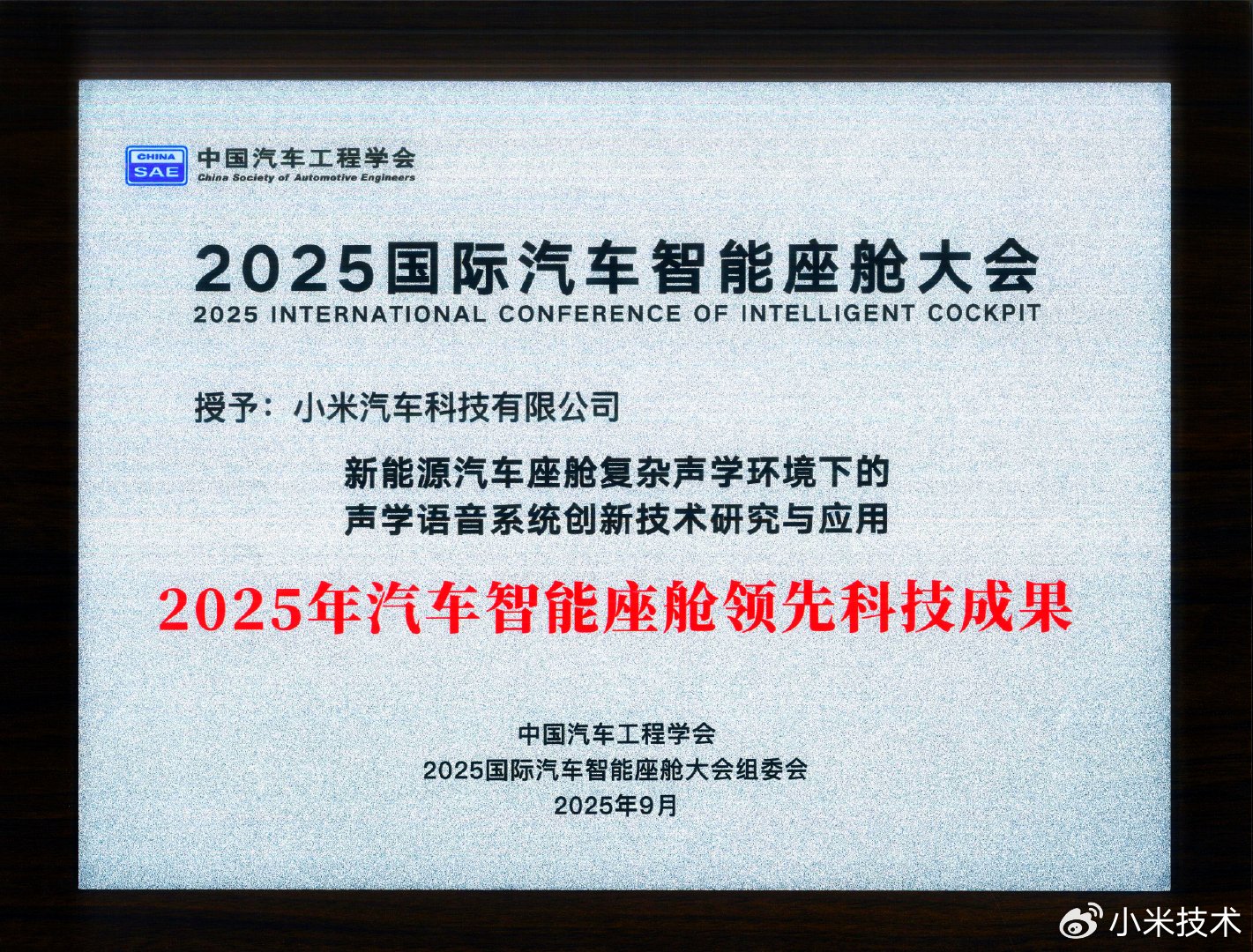 小米汽车在 2025 国际汽车智能座舱大会斩获“领先科技成果奖”