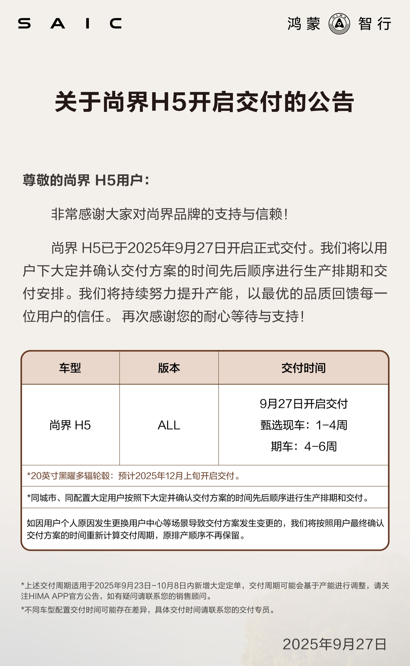 IT之家注意到,鸿蒙智行官方今日发布了“关于尚界 H5 开启交付的公告”,其中提到了新车交付的细节信息,重点如下: