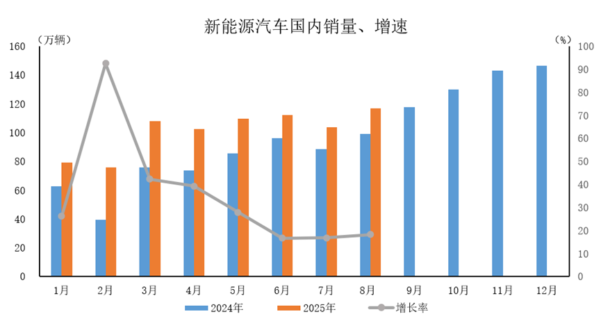 参考 9 月 17 日中国汽车工业协会(中汽协)发布的 2025 年 8 月新能源汽车产销情况简析,2025 年 8 月,新能源汽车产销分别完成 139.1 万辆和 139.5 万辆,同比分别增长 27.4% 和 26.8%。2025 年 1-8 月,新能源汽车产销分别完成 962.5 万辆和 962 万辆,同比分别增长 37.3% 和 36.7%。