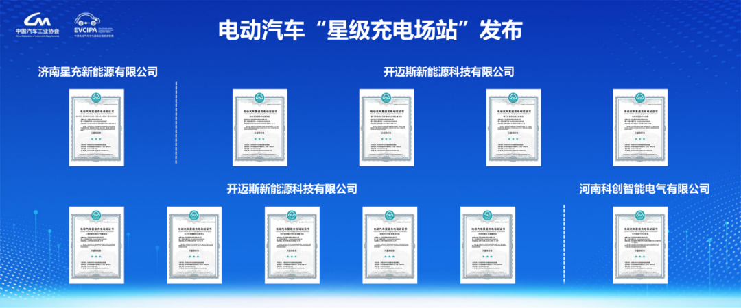 9 月 28 号下午,在“充电服务品质提升”分论坛上,中国充电联盟和中汽中心新能源检验中心共同为优秀充电运营企业颁发星级评价证书。