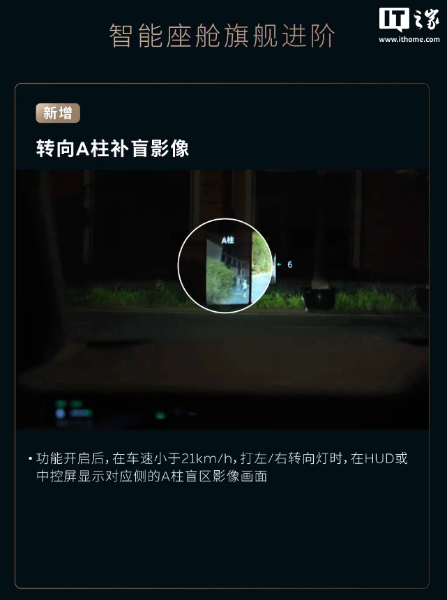 功能开启后,在车速小于 21km/h,打左 / 右转向灯时,在 HUD 或中控屏显示对应侧的 A 柱盲区影像画面
