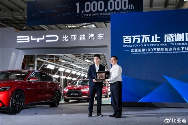 2021年5月19日,比亚迪举办第100万辆新能源汽车正式下线仪式,成为首个进入新能源汽车“百万辆俱乐部”的中国品牌。