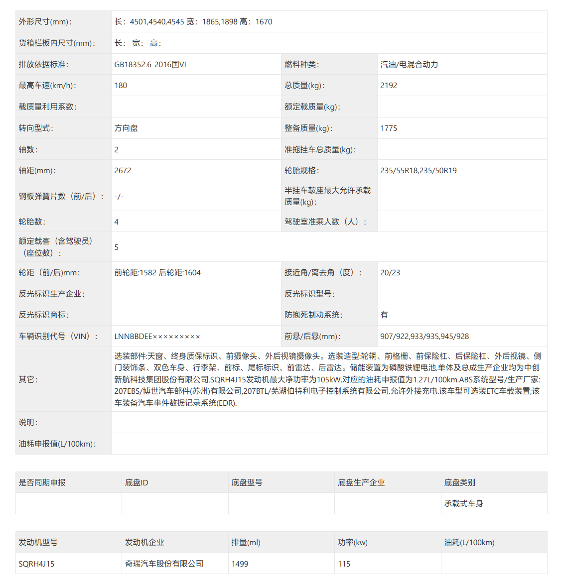 插电混动版:搭载 1.5T 发动机与电机组成的插电混动系统,发动机最大功率 115kW,匹配磷酸铁锂电池,油耗申报值为 1.27L / 100km。