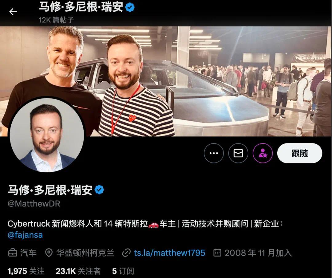所以这件事的可信度还是比较高的,爆料这件事的人也不是一般人。他的名字是马修·多尼根-瑞安(Matthew Donegan-Ryan),在主页介绍中,他声称自己是Cybertruck新闻的爆料人,也是14辆特斯拉汽车的车主。