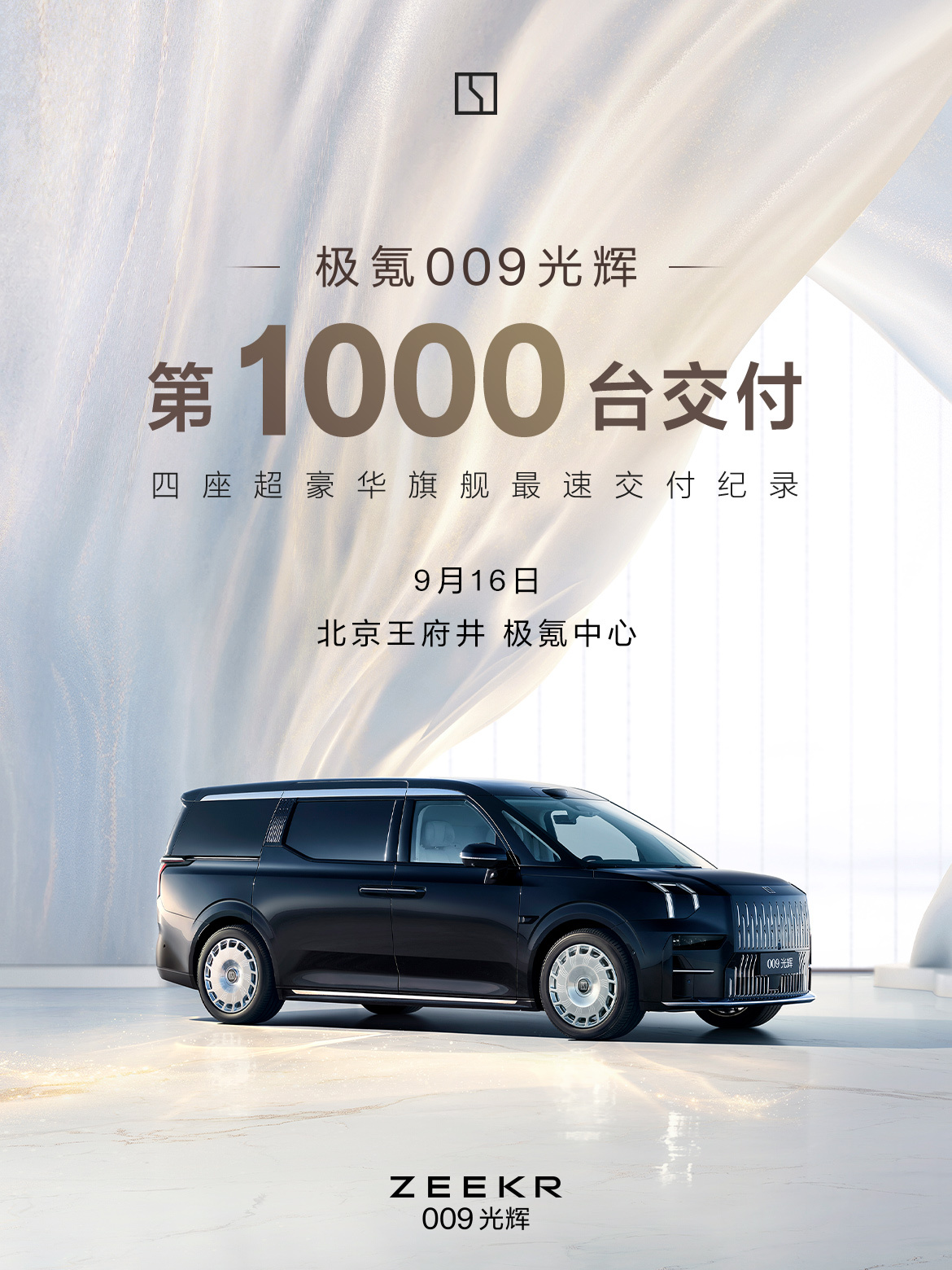 IT之家 9 月 15 日消息,极氪官方今日预告,极氪 009 光辉第 1000 台交付将于 9 月 16 日在北京王府井极氪中心举行,历时 115 天创造四座超豪华旗舰最速交付纪录。