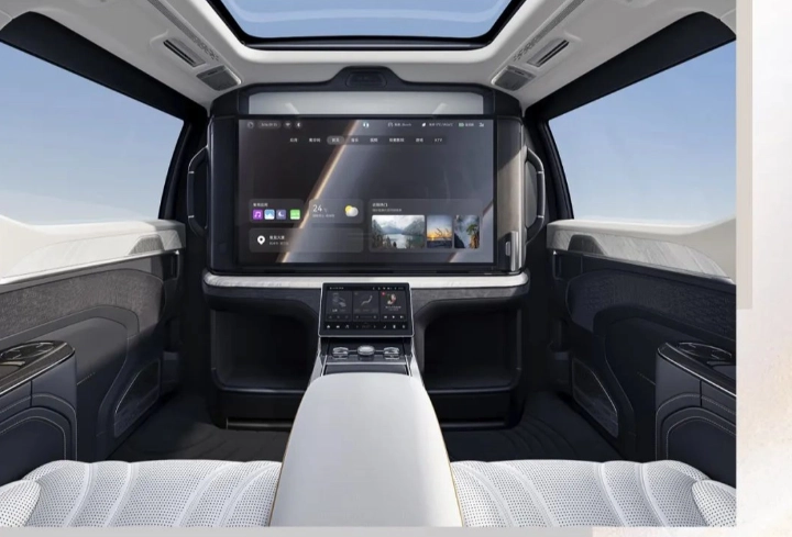 后排座舱配备 43 英寸云端智慧屏,采用隔板的形式将驾驶舱与乘员舱隔开