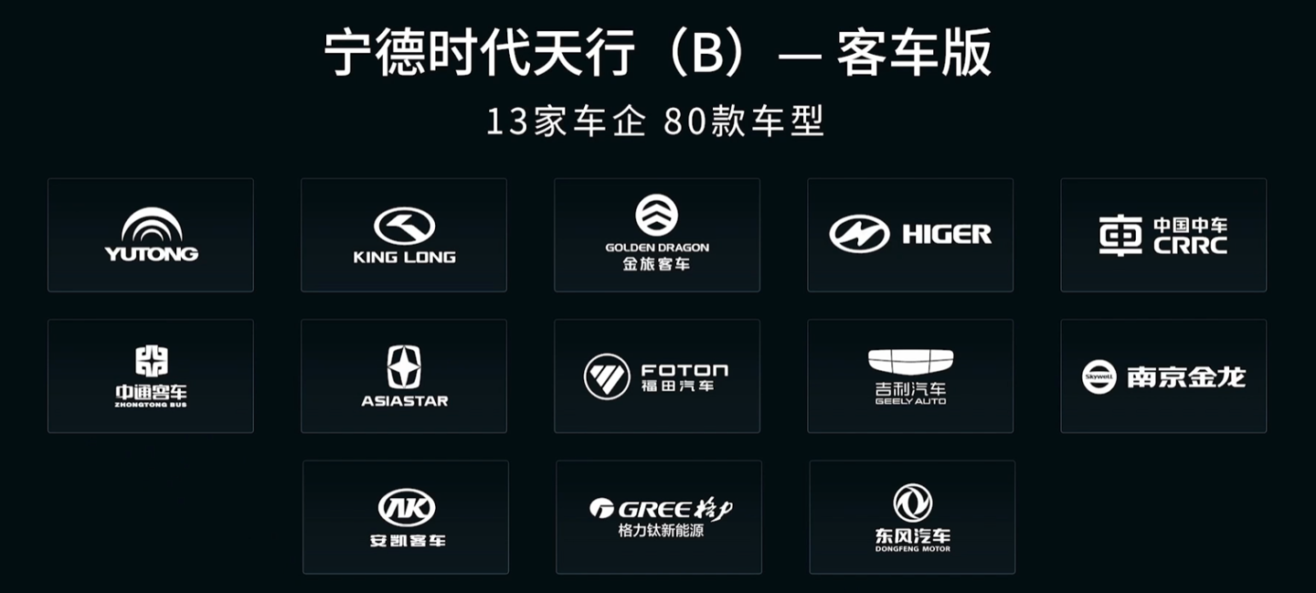 IT之家此前报道,宁德时代在今年 9 月 13 日发布天行客车电池解决方案,该电池能量密度达到 175Wh/kg,质保覆盖车辆全生命周期,最高达 15 年 150 万公里。该方案已与中通客车在内 13 家客户合作,将在 80 款车型上线。