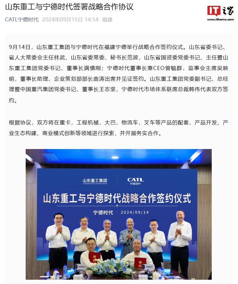 IT之家 9 月 15 日消息,宁德时代今日发文公布,山东重工集团 9 月 14 日与宁德时代在福建宁德举行战略合作签约仪式。双方将在重卡,工程机械,大巴,物流车,叉车等产品的配套、产品开发、产业生态构建、商业模式创新等领域开展合作。