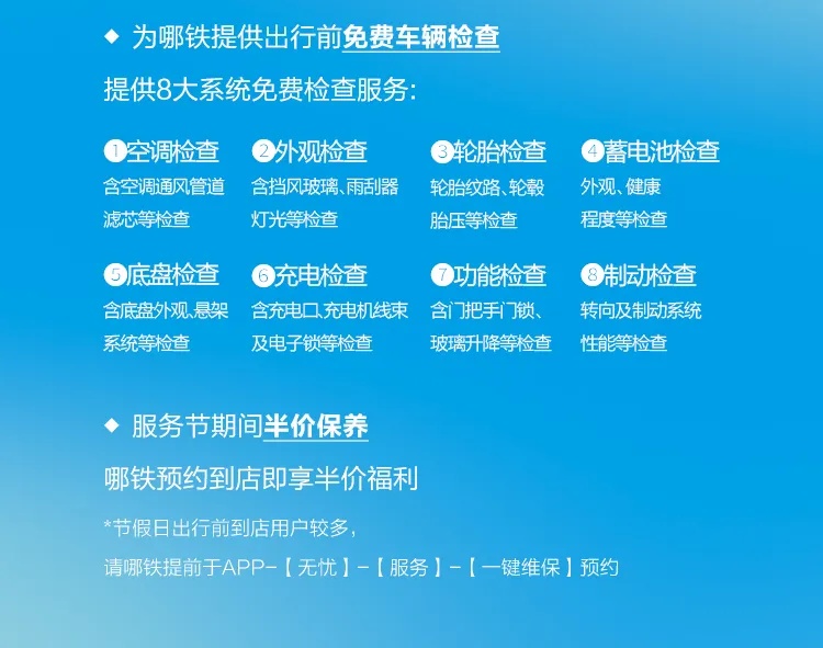 免费车辆检查:含空调、外观、轮胎、蓄电池、底盘、充电、功能、制动 8 大系统检查