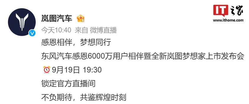 IT之家 9 月 15 日消息,岚图汽车今日宣布,东风汽车感恩 6000 万用户相伴暨全新岚图梦想家上市发布会将于 9 月 19 日 19:30 举行。