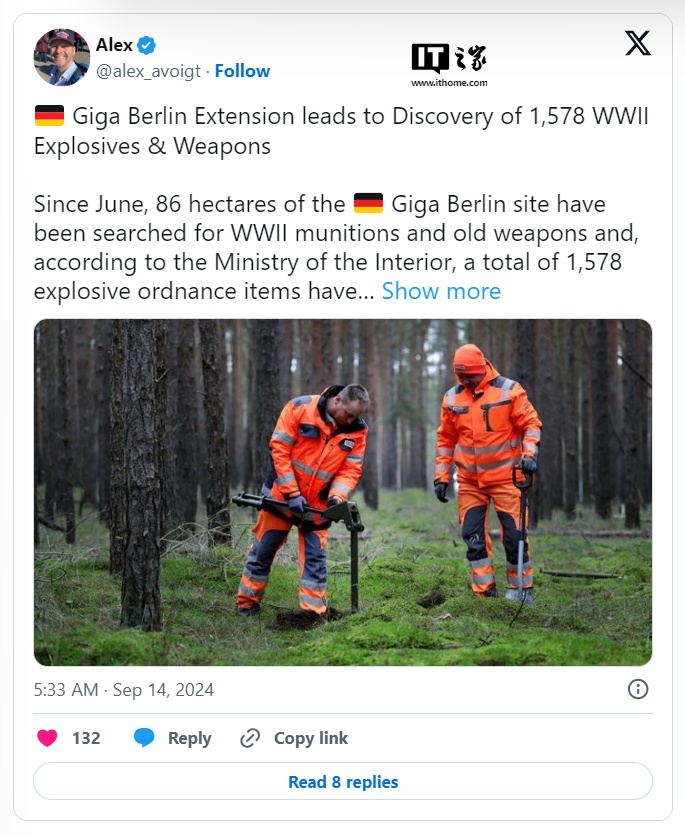 据 rbb24 报道,自 6 月以来,特斯拉柏林超级工厂周围的 86 公顷土地一直在进行弹药和旧武器的搜索。内政部表示,自搜索开始以来,已经在柏林超级工厂附近发现了 1578 枚弹药,其中包括两枚 250 公斤重的二战未爆炸弹药,这些弹药已在现场引爆。