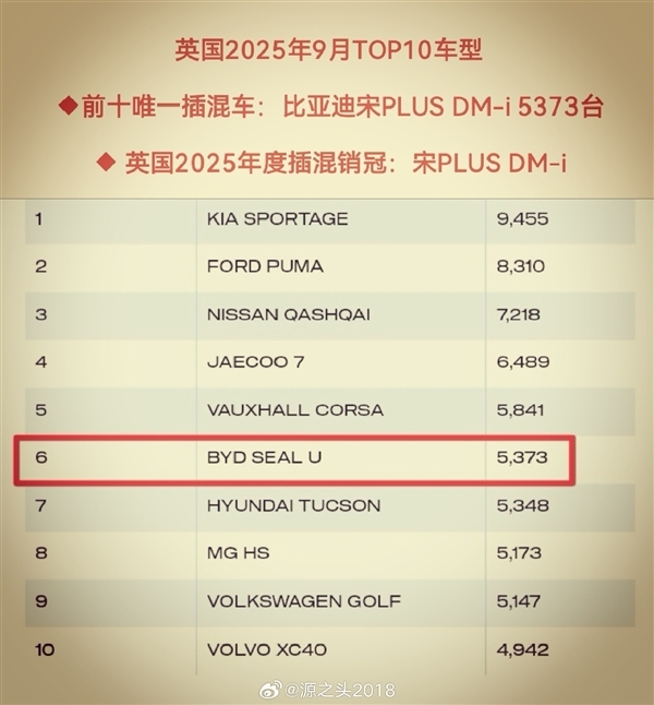 数据显示,比亚迪9月份在英国销量为11271台,并且,车型宋Plus DM-i销售5373台,挺进英国单车型销量Top10榜单,位列第六。