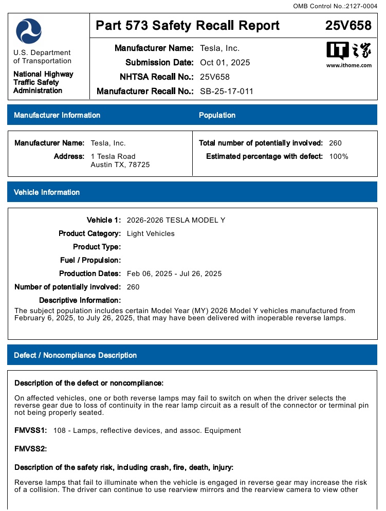 IT之家 10 月 7 日消息,根据美国国家公路交通安全管理局(NHTSA)最新公告,因车辆倒车灯存在潜在故障,特斯拉正召回 260 辆 2026 款 Model Y 车型。
