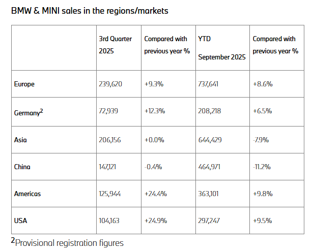 劳斯莱斯(Rolls-Royce)品牌在前九个月共交付 4,100 辆汽车,同比增加 3.3%。此外,宝马摩托车部门同期共交付 159,156 辆摩托车与踏板车,同比下降 2.6%;但第三季度实现回升,交付 53,247 辆,同比增长 5.7%。