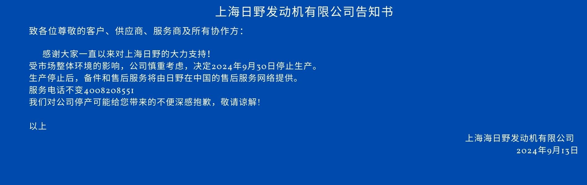 IT之家 9 月 15 日消息,上海日野发动机有限公司 9 月 13 日发布告知书,决定 9 月 30 日停止生产。
