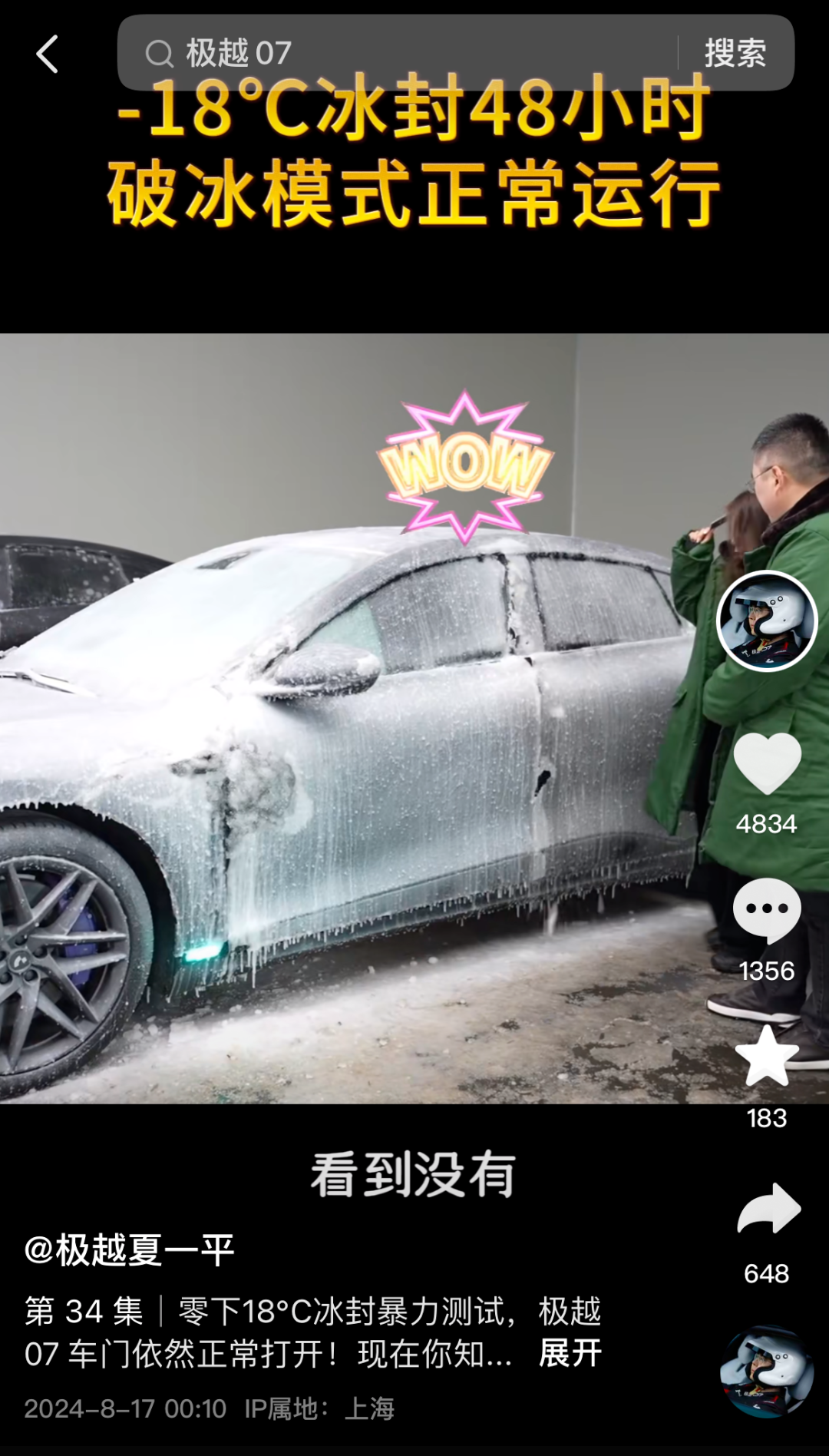 截至目前数据较好的一条视频是「-18度冰封暴力测试」,一辆极越07在严寒中完全被4-5毫米冰层覆盖,没有门把手的车用卡片钥匙依然能破冰成功。这项测试内容也出现在9月10日的发布会现场。这条视频点赞量近5000。此外20米高坡翻滚实验、碰撞试验相关视频的数据都不错。