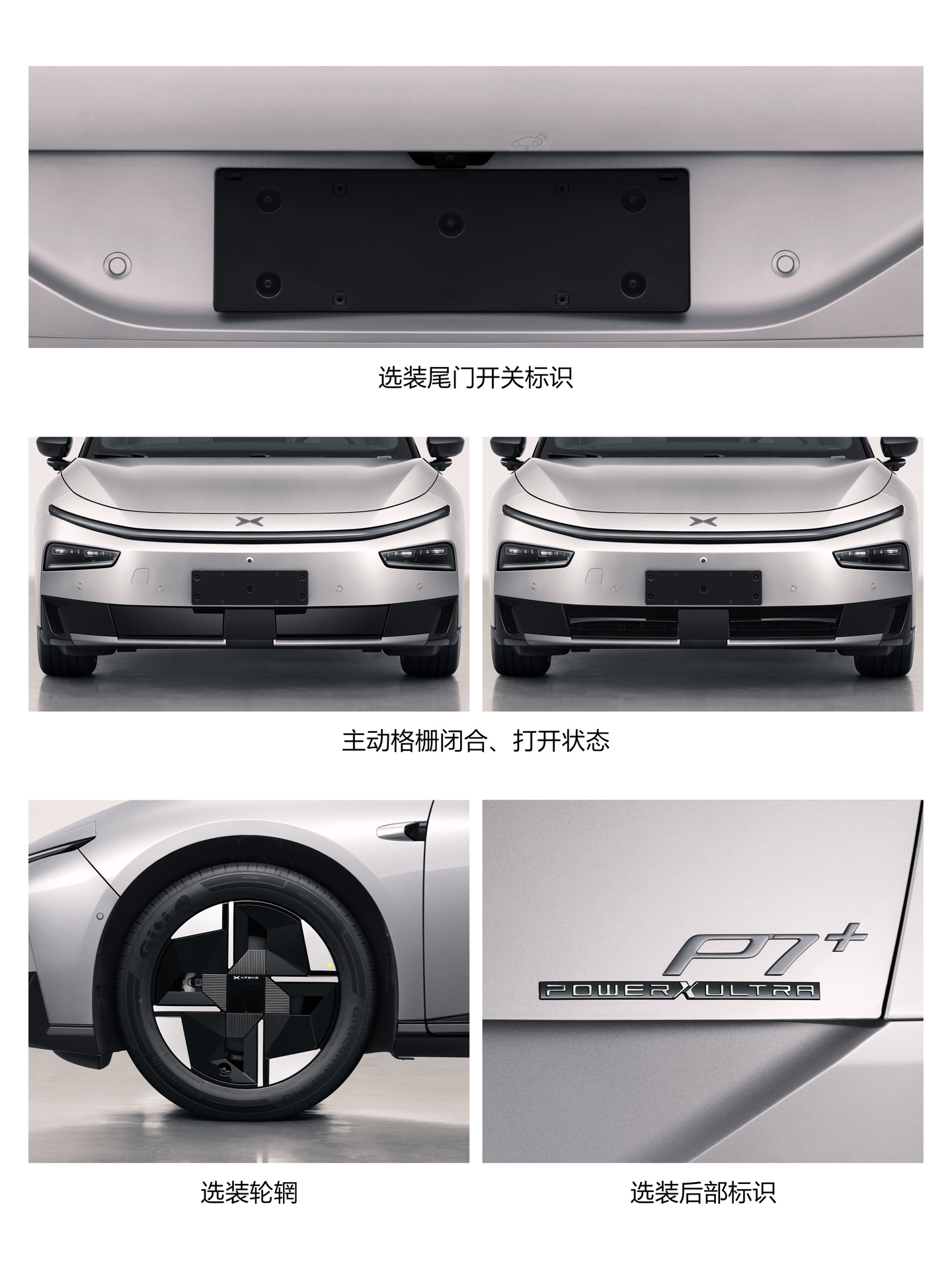 小鹏 P7 + 增程版长宽高为 5071*1937 *1512mm,轴距为 3000mm,搭载湖北亿纬动力有限公司的磷酸铁锂蓄电池,以及东安动力 1.5T 增程器(110kW),尾标增加了“Power X”/“POWER ULTRA”字样。