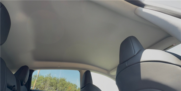 但事实是,丐版 Y 的车顶材质依旧是玻璃的。之所以车里看着没有天幕,是因为特斯拉在生产的时候直接在玻璃车顶下面加了个织物顶棚。