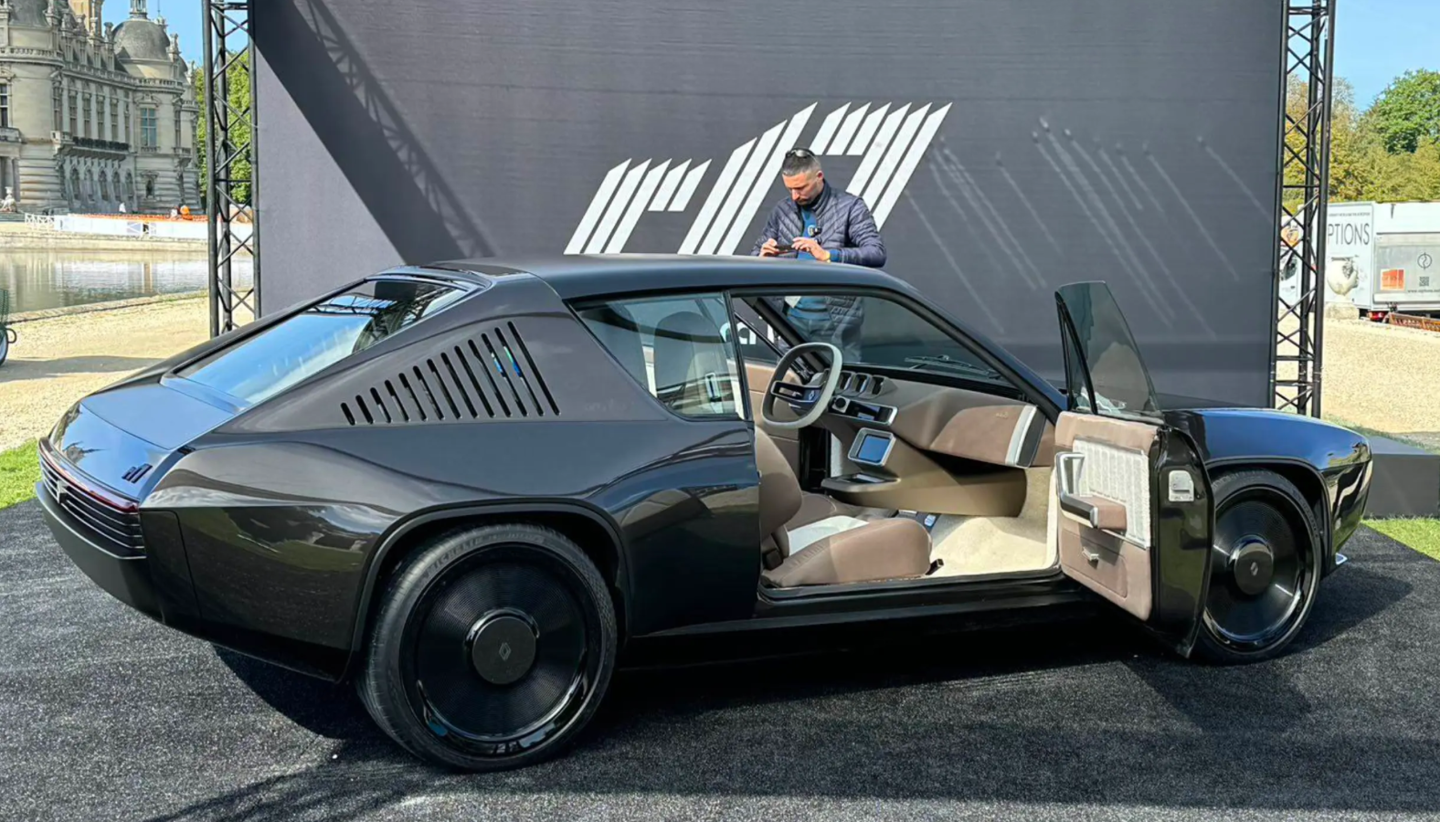 外观方面,该车由雷诺品牌与法国设计师 Ora Ïto 联手打造,可以理解为雷诺在 20 世纪 70 年代推出的雷诺 17 轿跑车的纯电复刻版本,其整体延续了雷诺 17 轿跑车的元素,采用双门设计,使用扁平的前面板取代进气格栅,同时配有封闭式轮辋,视觉效果更具赛博朋克风格。