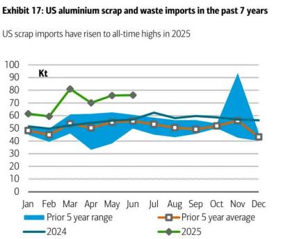 近7年美国废铝进口量,2025年进口突破历史峰值