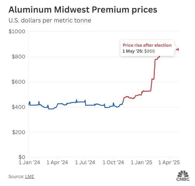 结果就是,美国本土铝价大幅攀升,推高下游制造业成本,反而抑制了对铝产品的需求。