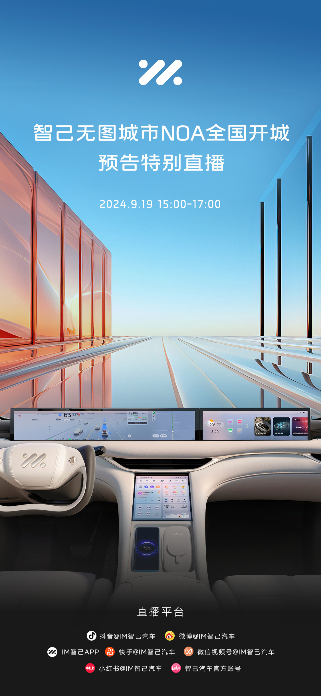 智己汽车宣布将于 9 月 19 日 15:00 举行智己无图城市 NOA 全国开城预告特别直播,提供多城连播,IT之家届时将为大家带来详细报道。