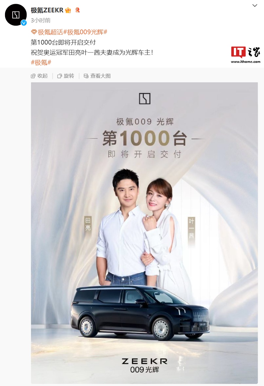 IT之家 9 月 16 日消息,极氪今日发文宣布,第 1000 台极氪 009 光辉版车型将开启交付,车主为奥运冠军田亮叶一茜夫妻。