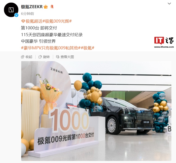 据介绍,极氪 009 光辉第 1000 台交付将在北京王府井极氪中心举行,历时 115 天创造四座超豪华旗舰最速交付纪录。