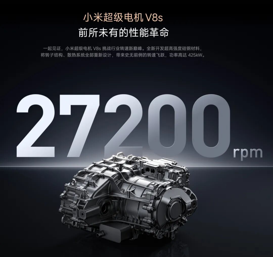 比如 SU7 Ultra 用的 V8s ,最大功率 425kW ,最高转速 27200rpm ;而仰望 U9 直接用 4 个 555kW 电机,总功率达到 2200kW 。