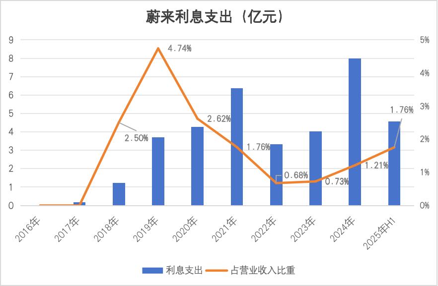 从2016年到2025年Q2,蔚来利息支出经历了两个阶段的攀升。