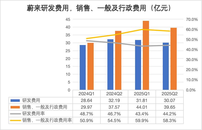 蔚来管理层在财报中着重强调了“结构性拐点”的来临。数据表明,扣除特殊费用后(股权激励及组织优化),二季度研发费用环比下降14.6%,降至24.89亿元;销售、一般及行政费用环比下降12.6%,降至36.8亿元。这种成本优化主要源于三个方面:人员结构的合理调整、营销费用的精简以及组织流程的再造。