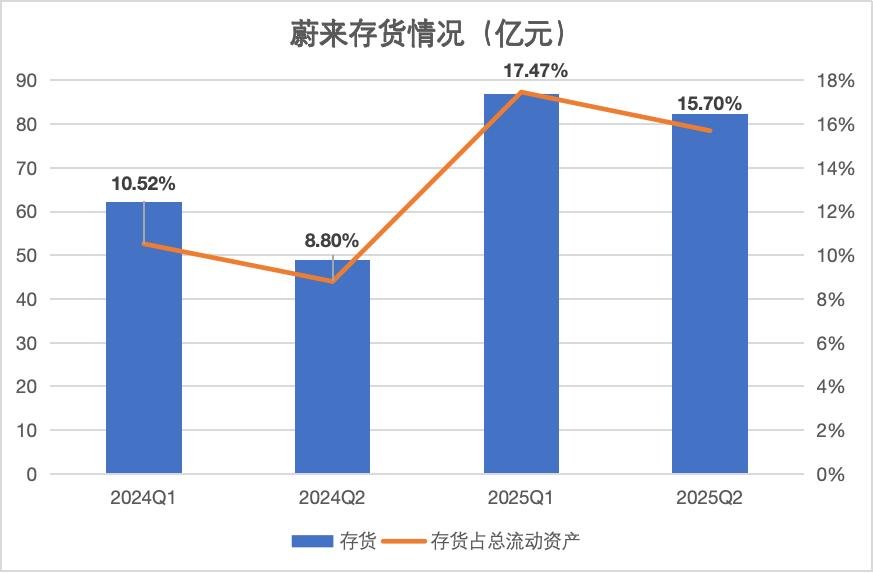 财报显示,蔚来今年上半年存货169.39亿元,同比大幅增长52.7%,其中二季度存货82.43亿元,同比增长68.7%。
