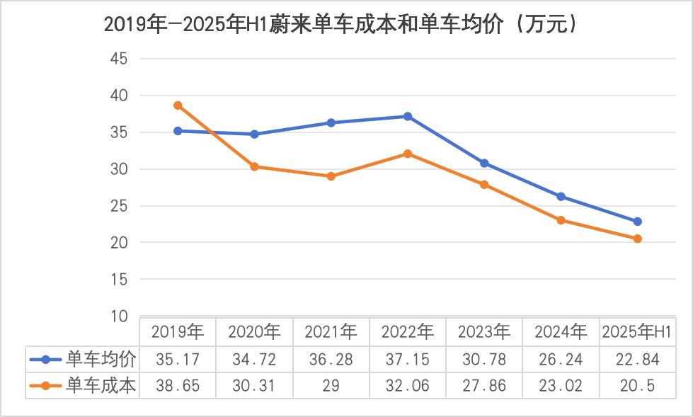 2021~2022年,全球锂、钴、镍等原材料价格暴涨,碳酸锂价格从2020年的4.56万元/吨飙升至2022年的48.21万元/吨,直接推高电池包成本,导致蔚来单车成本从2020年的30.31万元上升至2022年的32.06万元,上升约1.75万元。2023年以后,碳酸锂价格虽一路暴跌,但蔚来单车成本的下降幅度不及单车均价的降幅。2022年至2025年H1,蔚来单车成本下降约11.56万元,单车均价下降约14.31万元。