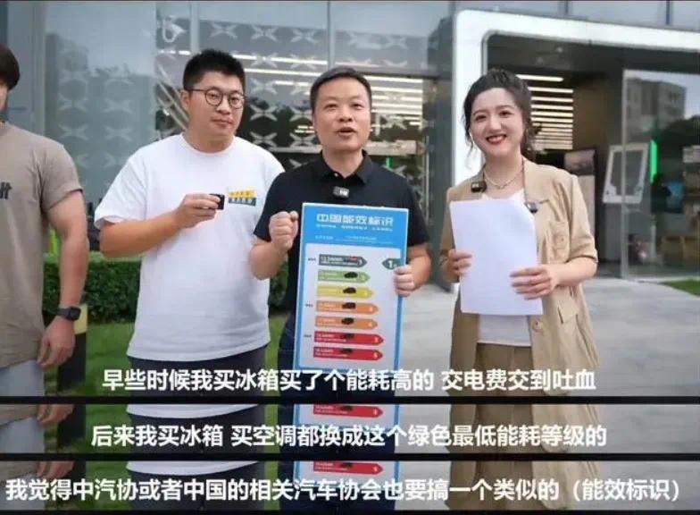 小鹏汽车CEO何小鹏在最近的一次光电测试直播中,建议中汽协或其他汽车协会搞一个类似于家电的能效标识,直言他早前买了高能耗家电后,“交电费交到吐血”。