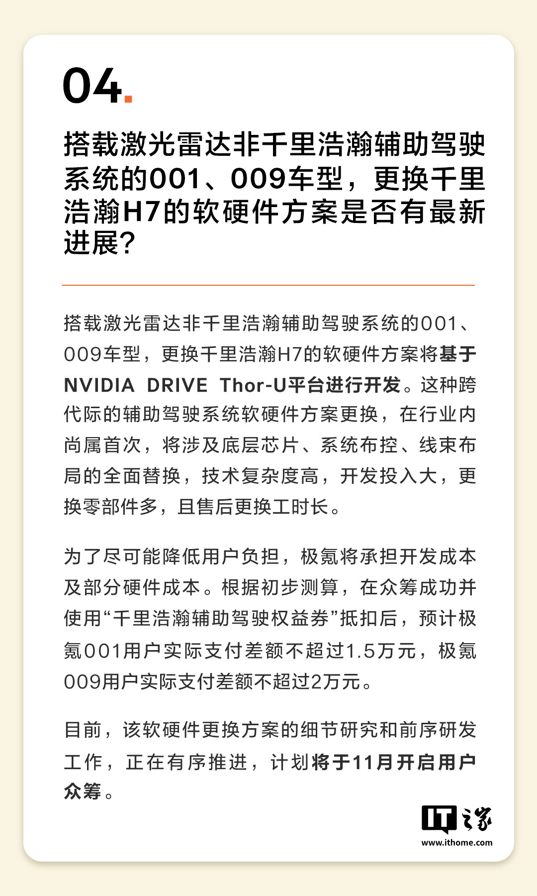 根据初步测算,在众筹成功并使用“千里浩瀚辅助驾驶权益券”抵扣后,预计极氪 001 用户实际支付差额不超过 1.5 万元,极氪 009 用户实际支付差额不超过 2 万元。目前,该软硬件更换方案的细节研究和前序研发工作,正在有序推进,计划将于 11 月(下月)开启用户众筹。