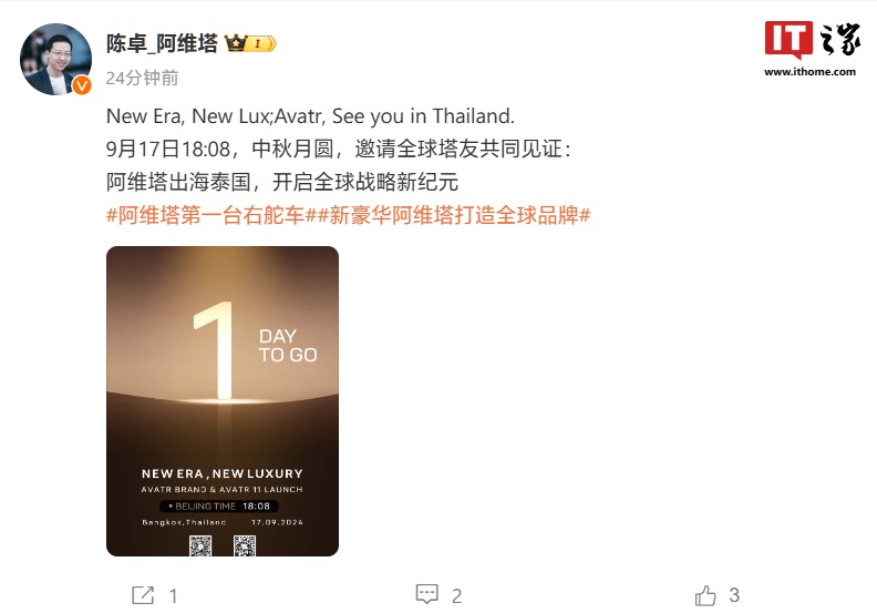 IT之家 9 月 16 日消息,阿维塔科技总裁陈卓今天下午宣布,阿维塔第一台右舵车即将登陆泰国市场,开启全球战略的“新纪元”,当地市场的发布会将在北京时间 9 月 17 日 18 时 08 分举行。