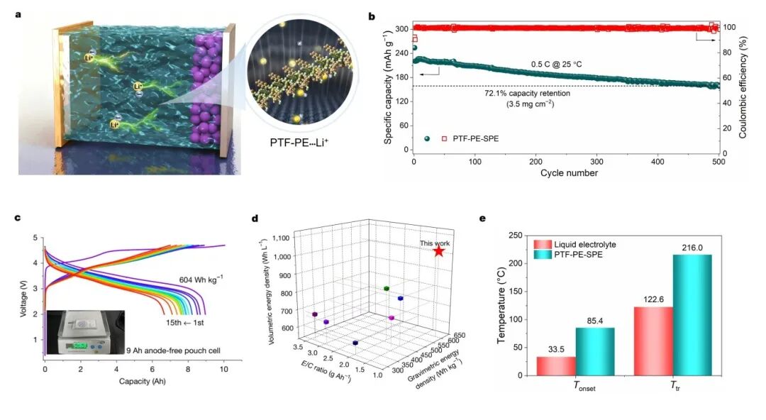 这款电池的寿命表现和安全性也很好。在电池测试中,采用FPE-PE-SPE的电池在0.5C倍率下循环500次后,容量保持率仍有72.1%。相比之下,使用传统PE-SPE电解质的电池循环50次后容量就衰减至80%。针刺测试中,满电的FPE-SPE软包电池也表现出对内部短路的超强耐受性。