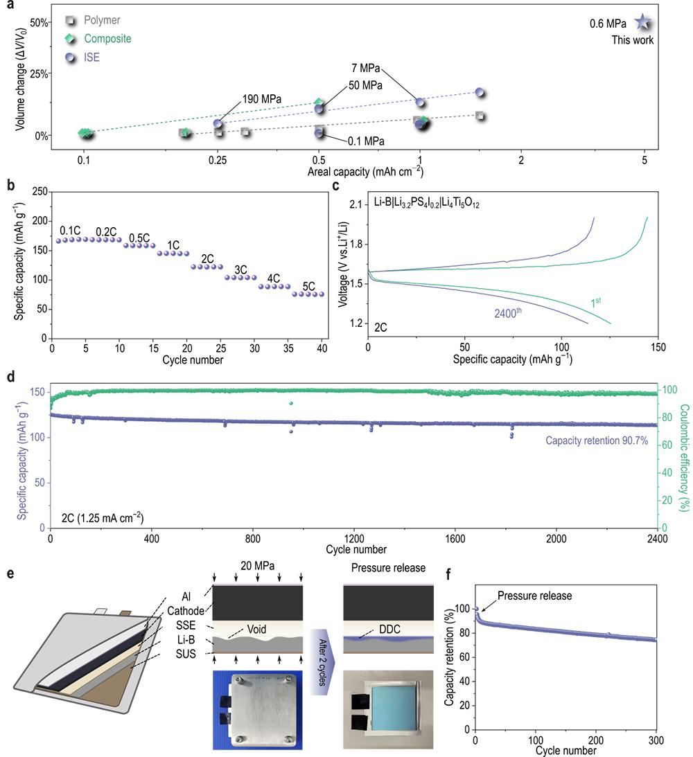 根据论文,这项研究可以使固态电池在充放电的时候形成一层DAI(动态自适应界面,Dynamic Adaptive Interface),最终在低压甚至零外压下维持稳定循环。在电池脱离实验室环境的情况下,软包电池实现300次循环后容量仍高于70%,并支持5C级充放倍率。